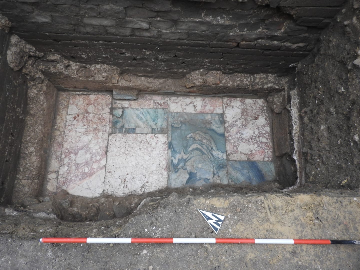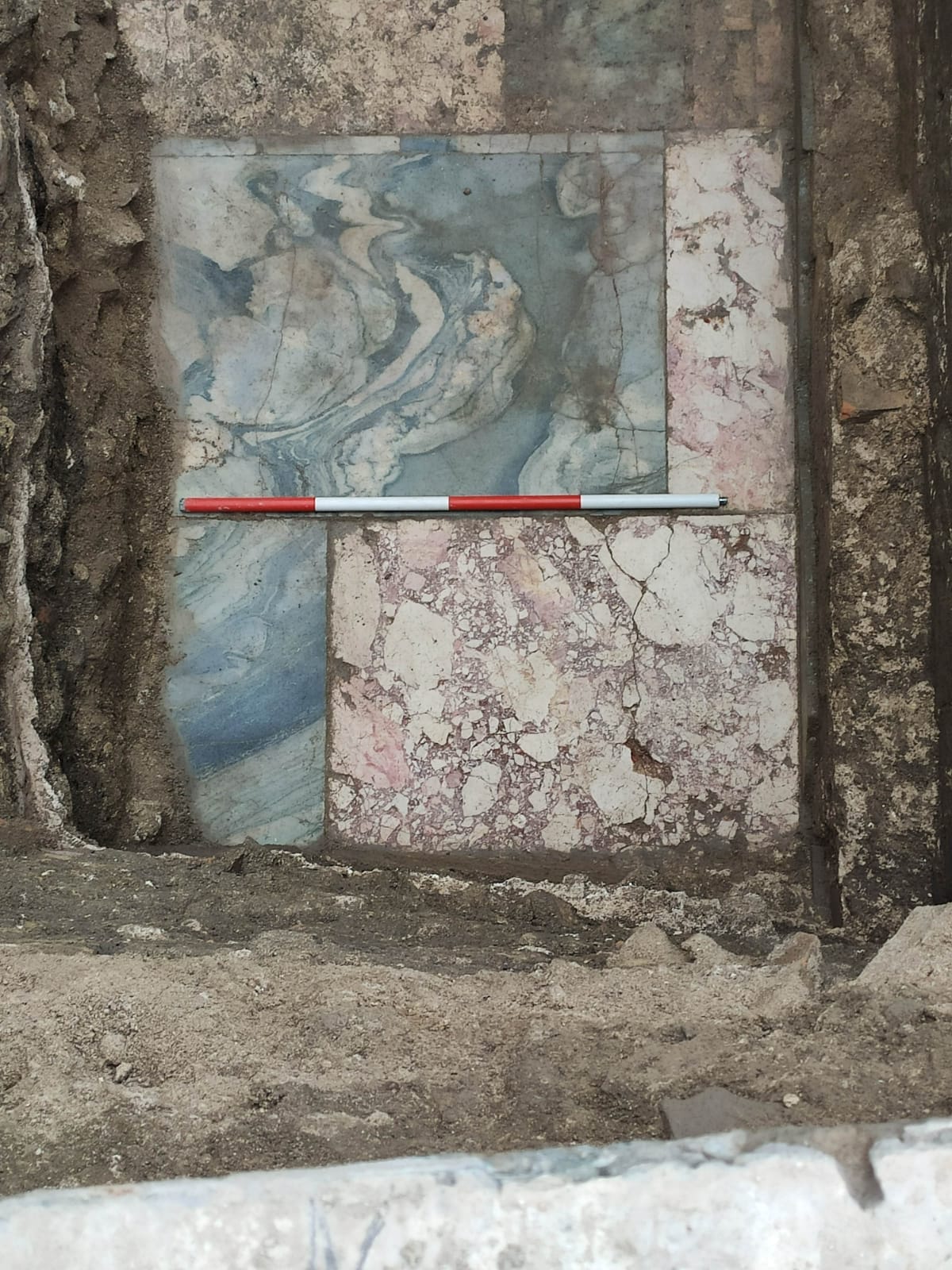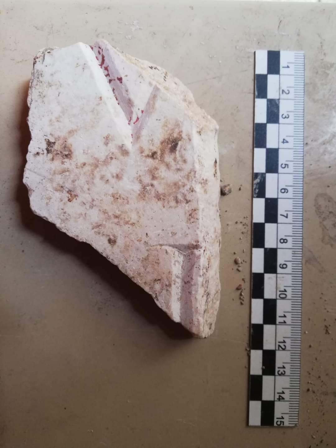 Fra i materiali recuperati, vi è anche un frammento di iscrizione su marmo che riporta su due righe le lettere V e I e conserva ancora tracce della “rubricatura”, ovvero la colorazione in rosso dei solchi delle lettere incise.