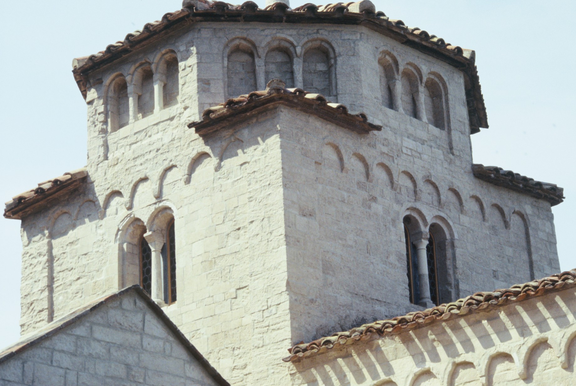 L’esterno della chiesa rivela l’articolazione interna dello spazio, con una sovrapposizione di volumi di diverse dimensioni in cui il campanile a vela e l’avancorpo che si addossa alla facciata a salienti vanno considerati elementi più tardi. I muri esterni sono sottolineati da lesene e archetti pensili, sostituiti da un loggiato cieco che corona l’abside maggiore e il tiburio.