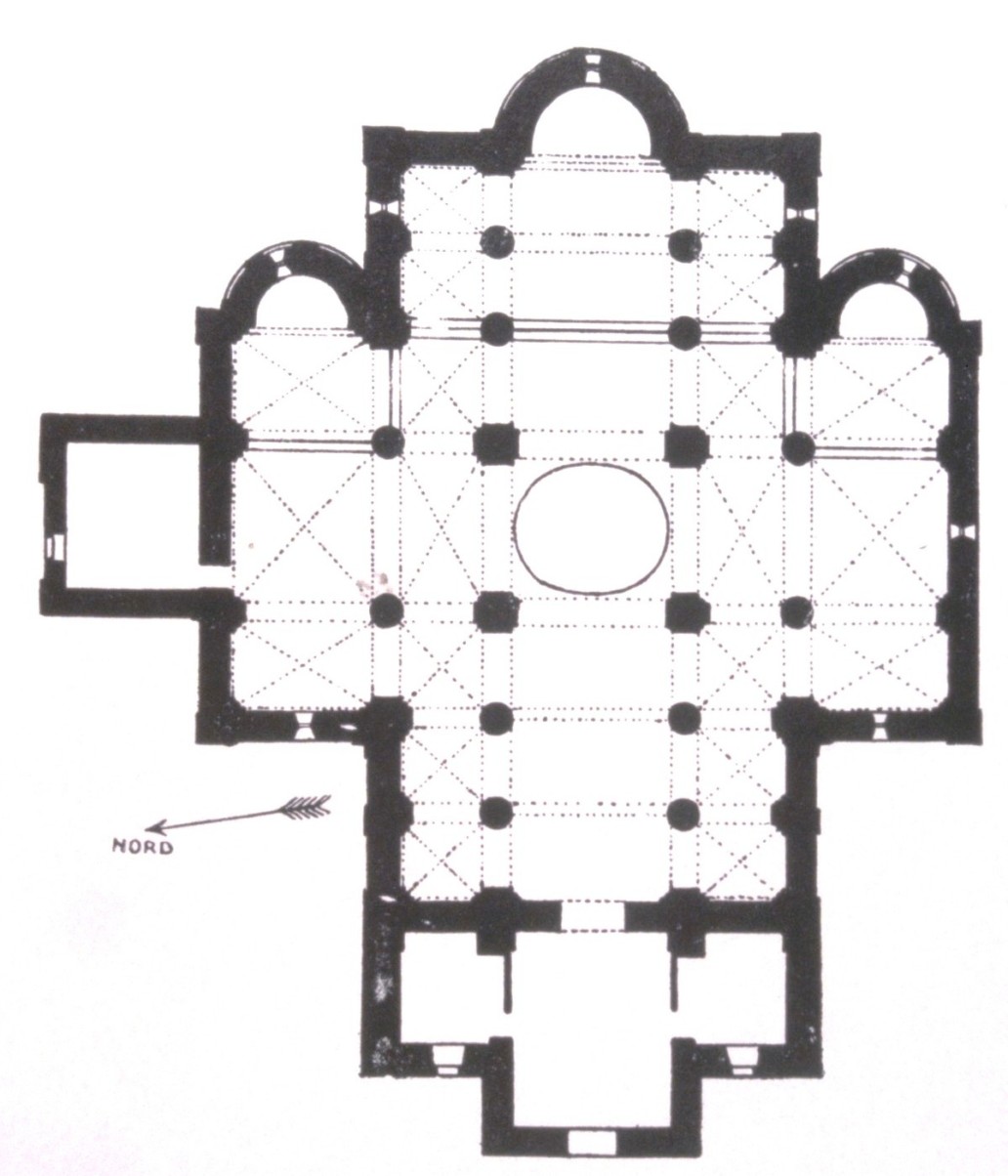 All’interno dell’edificio notevolissima è la qualità delle soluzioni spaziali ottenuta con la semplice eleganza delle linee architettoniche, con la misura delle superfici lasciate in pietra a vista, con gli effetti della luce che, dalle monofore a doppio strombo (piccole e sapientemente disposte), penetra con taglio radente e, dalla cupola, attraverso le quattro bifore del tamburo, scende a rischiarare diffusamente l’ambiente.